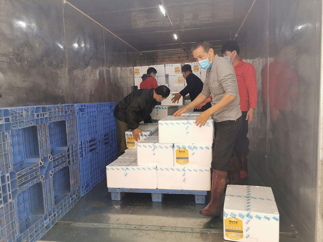 海纳公司的员工在装车。这些金鲳鱼是阳江海纳水产有限公司(以下简称“海纳公司”)捐赠的。新型冠状病毒感染的肺炎疫情牵动着全国人民的心,2月4日,省农业农村厅发出《广东农企驰援湖北爱心公益捐赠行动倡议书》,号召省内农业、渔业龙头企业支援湖北,让抗击疫情一线的工作人员吃上富有营养又健康的食品,增强抵抗力。海纳公司迅速响应,捐赠5吨价值20万元的金鲳鱼冻品。黄冈是湖北抗击疫情“第二大战场”,经省农业农村厅联络,最终决定将第一批物资运往黄冈市,用于保障黄冈地区病人和医护人员营养餐和工作餐。