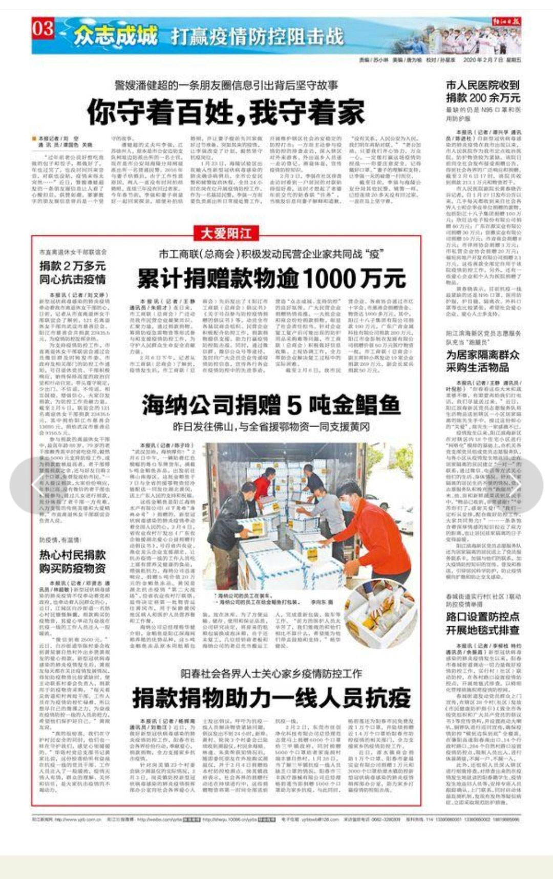 “武汉加油,海纳撑你!”2月6日中午,一辆贴着红色横幅的粤Q车牌货车,满载5吨金鲳鱼冻品,出发前往佛山南海区。这批金鲳鱼于7日与全省的援鄂物资经冷链配送一同发往湖北黄冈,送上广东人民的支持和祝福。